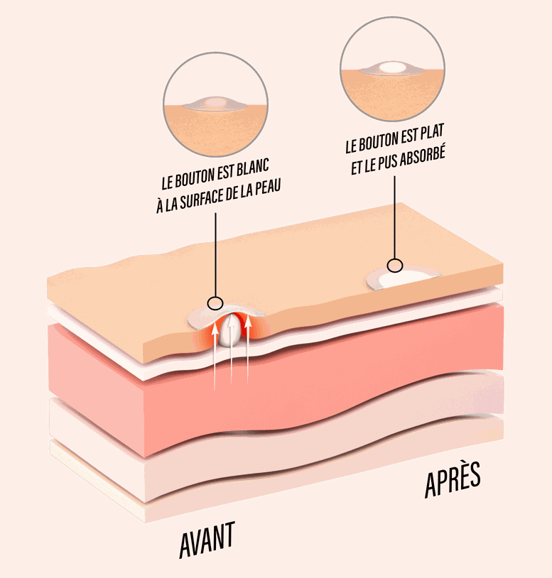 - Lorsque ton bouton est blanc : il va permettre d’absorber le contenu du bouton sans avoir besoin de le popper et donc éviter l’apparition de marques et de cicatrices.